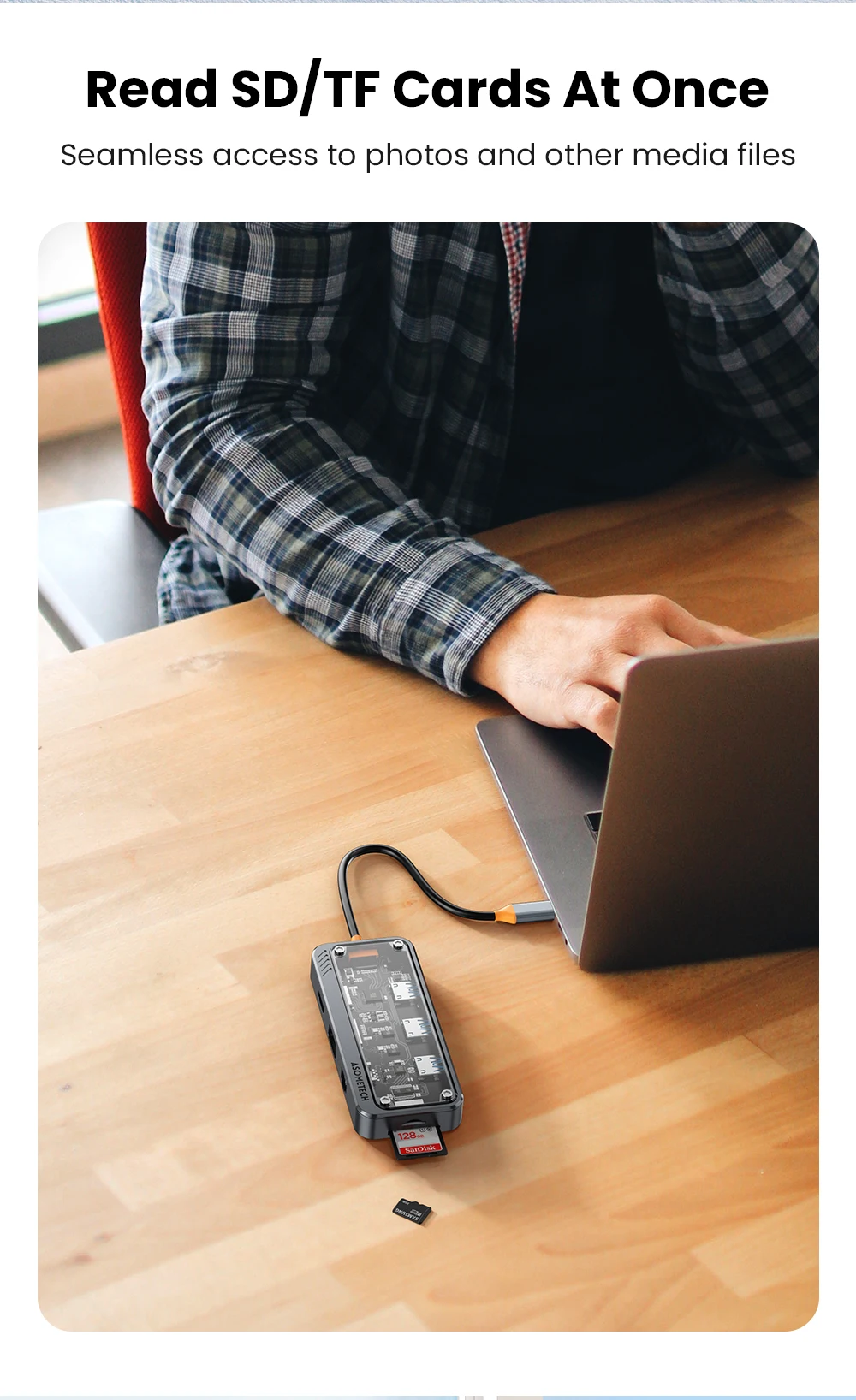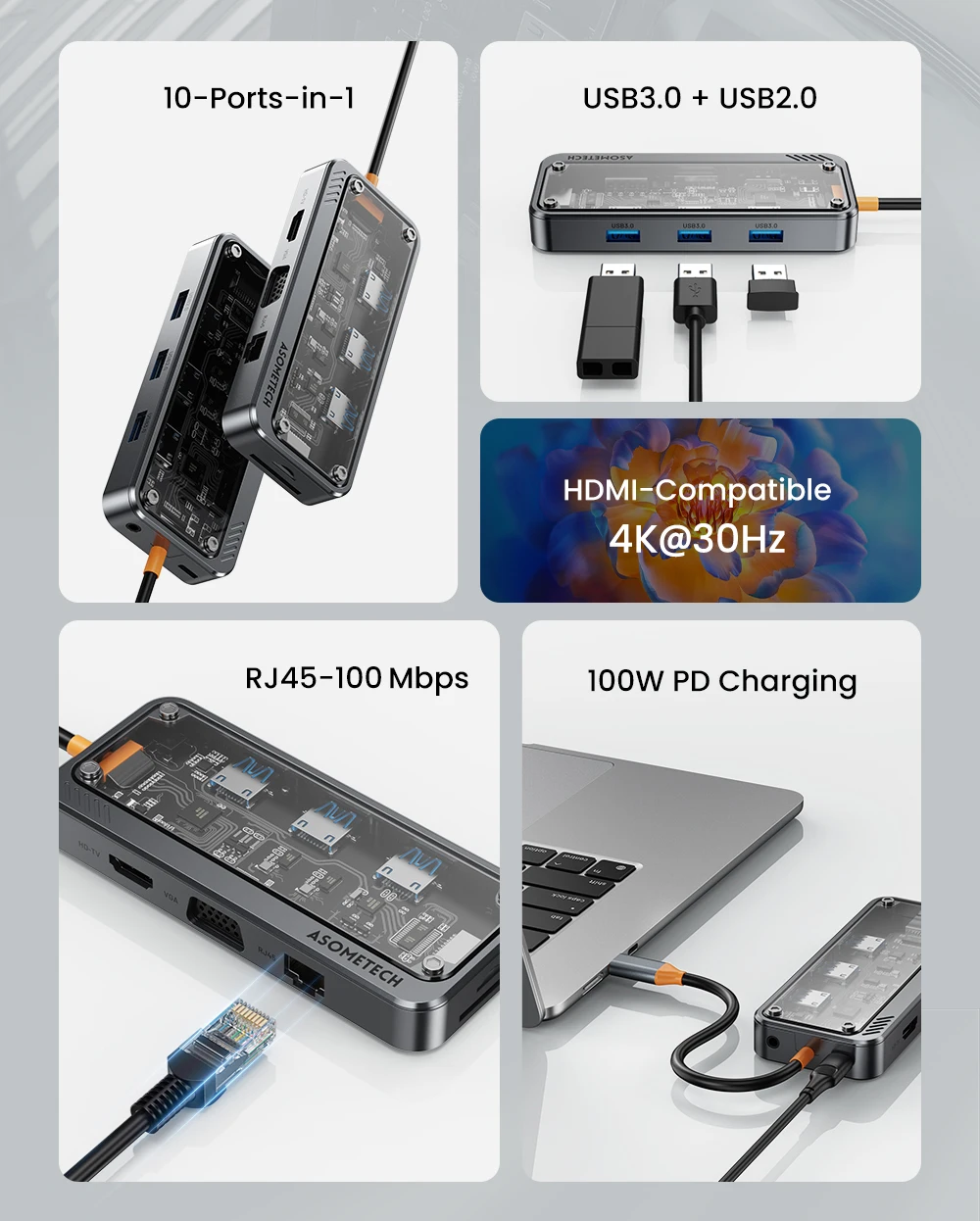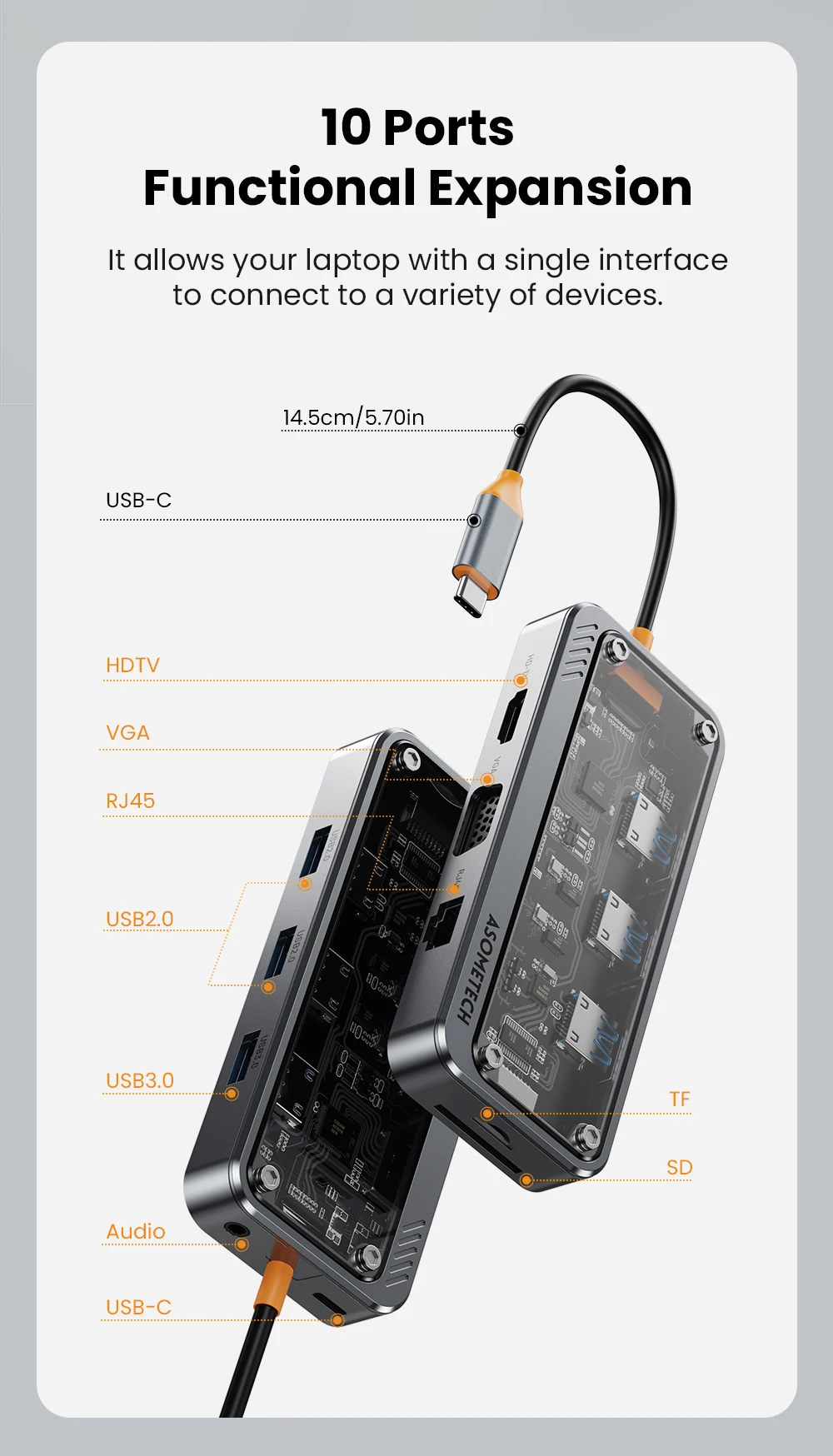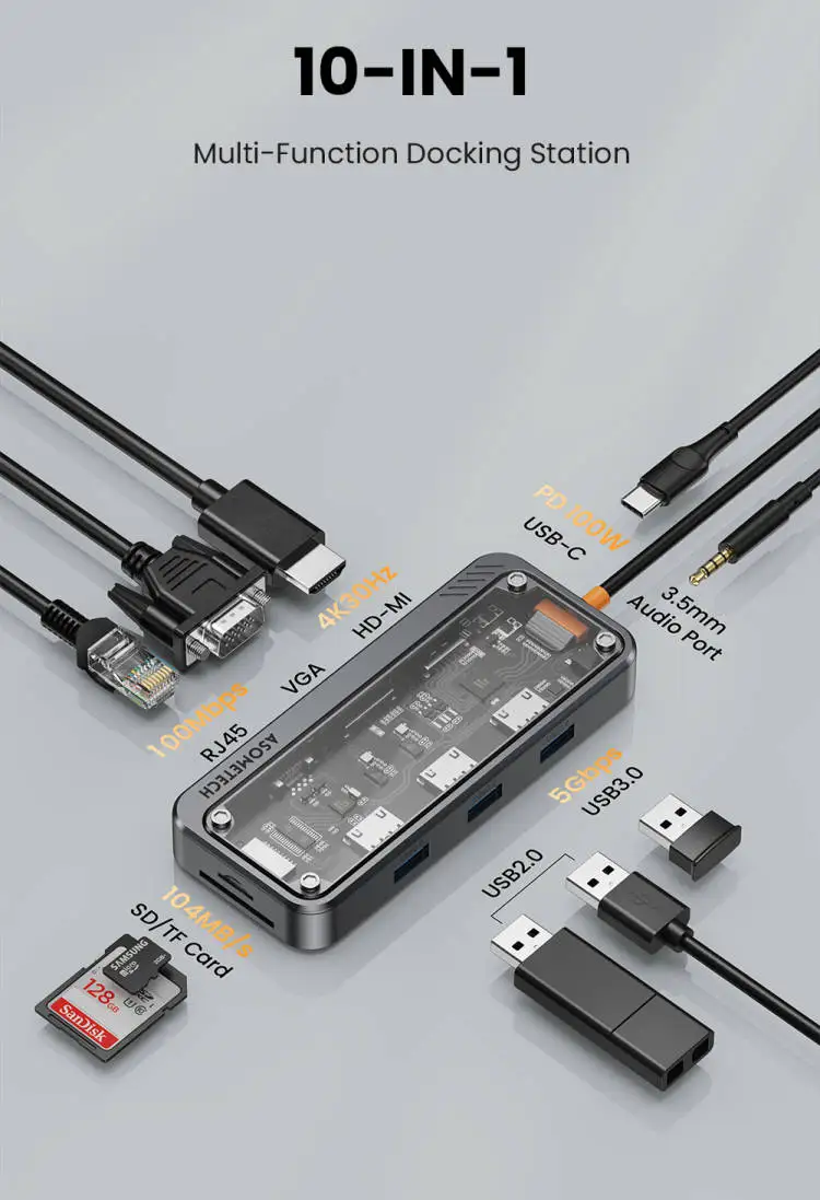 Maximize your productivity with the 10-in-1 USB-C Docking Hub — the ultimate all-in-one solution for MacBook, Windows laptops, and tablets. This sleek aluminum hub delivers lightning-fast data transfer, crystal-clear 4K HDMI video output, and powerful 100W PD charging, all through a single USB-C connection. With 10 versatile ports including HDMI, USB-A, USB-C, SD, MicroSD, and RJ45, it’s perfect for creators, remote workers, or anyone who needs a fully connected workspace.