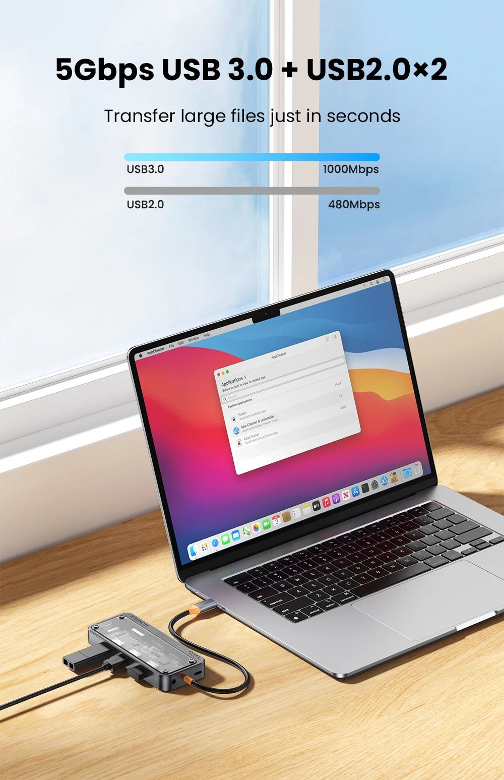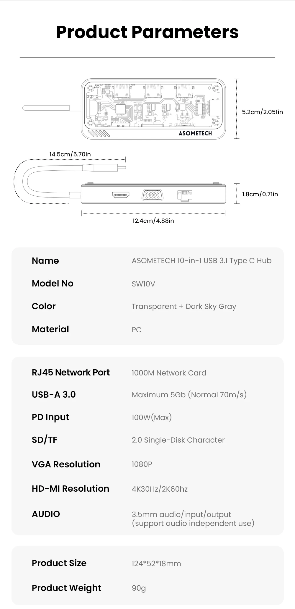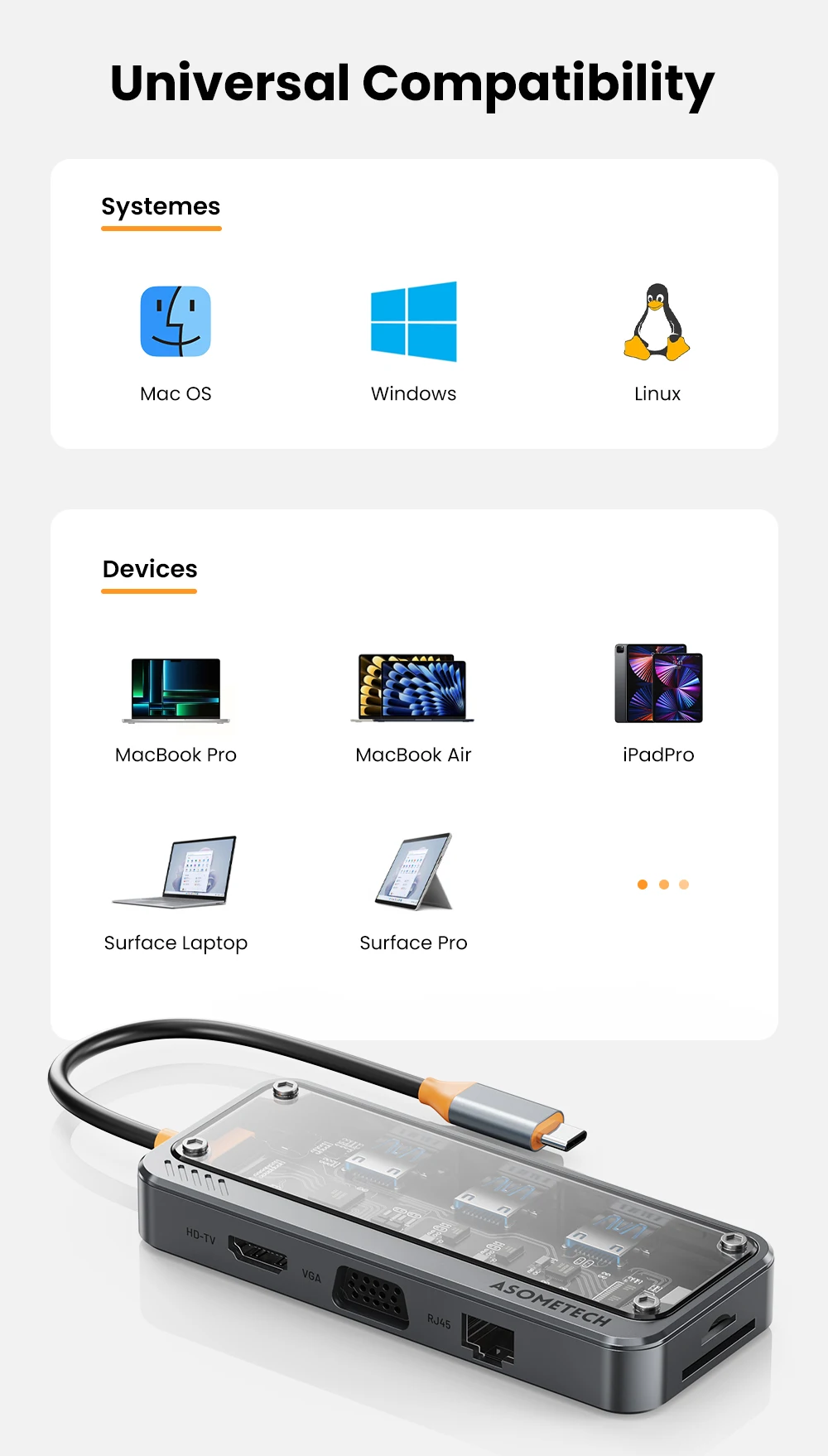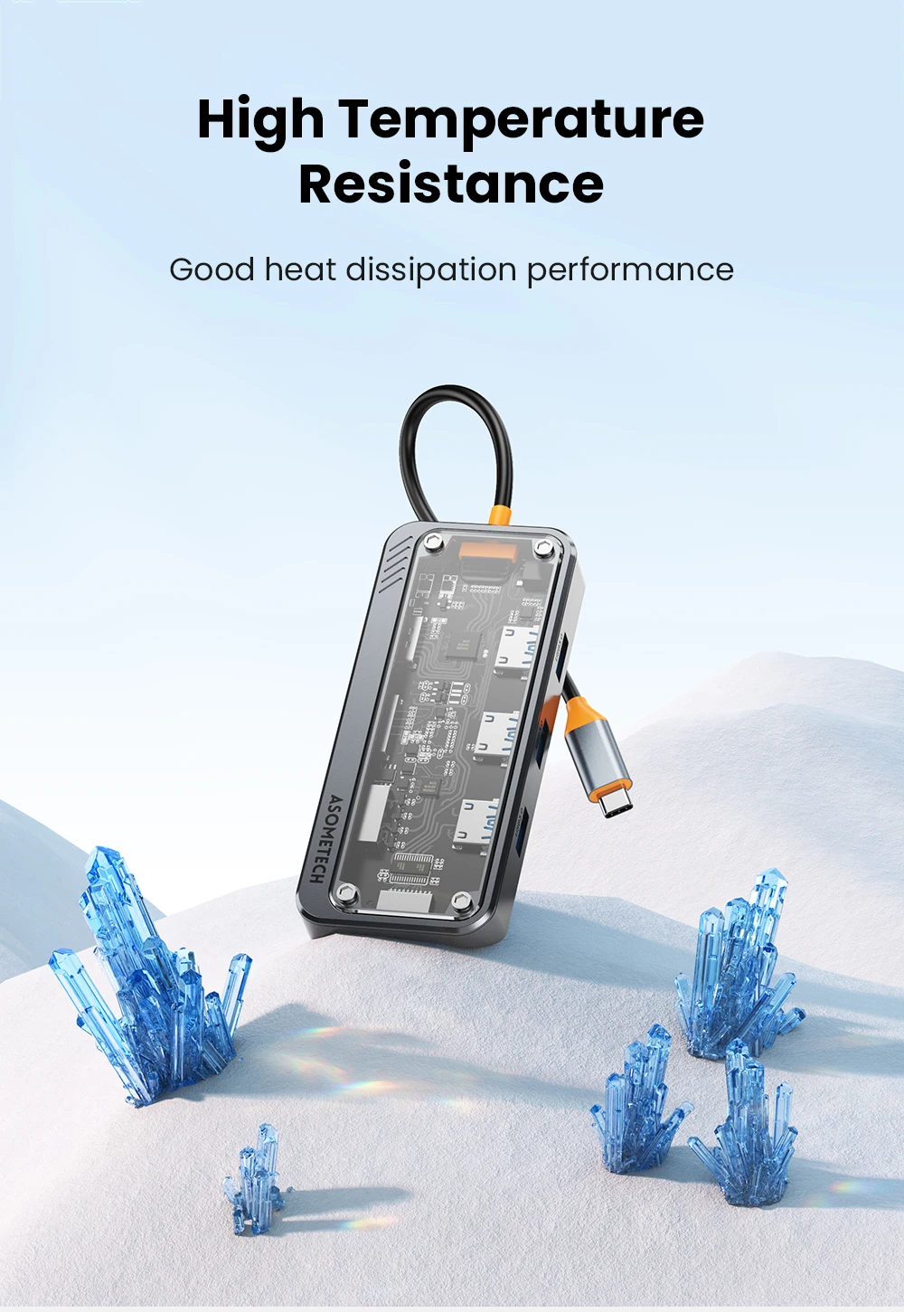 Designed for plug-and-play convenience, the ASOMETECH ASA10 USB 3.0 hub ensures seamless compatibility with MacBook Pro, MacBook Air, and most USB-C devices. Its compact 12.4cm design fits neatly into any desk setup while supporting high-speed data, fast PD charging, and multi-device connectivity. Certified CE, FCC, RoHS, and UL, this hub combines performance, safety, and style — making it the essential tool for efficient, clutter-free work or travel setups.